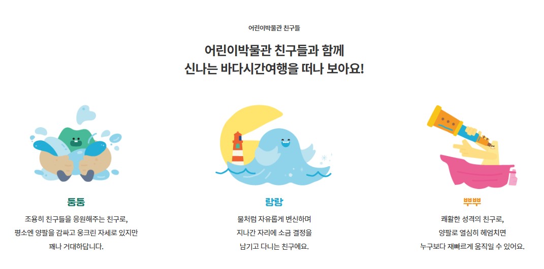 어린이박물관에는 세 친구가 모험을 도와준답니다! 둥둥, 랑랑, 뿌뿌를 만나보고, 바다탐험가가 되어 보세요.