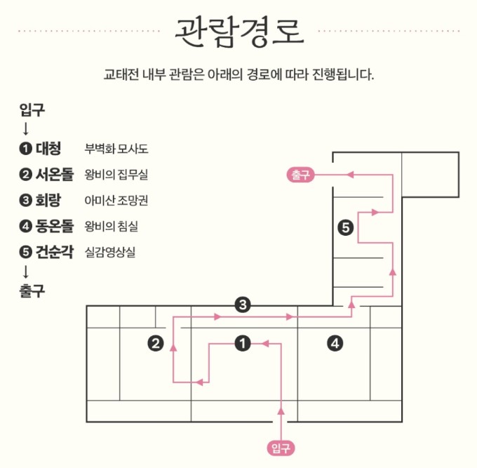 - 교태전 앞 직원에게 성함 혹은 예약번호 제시하면 입장 도움