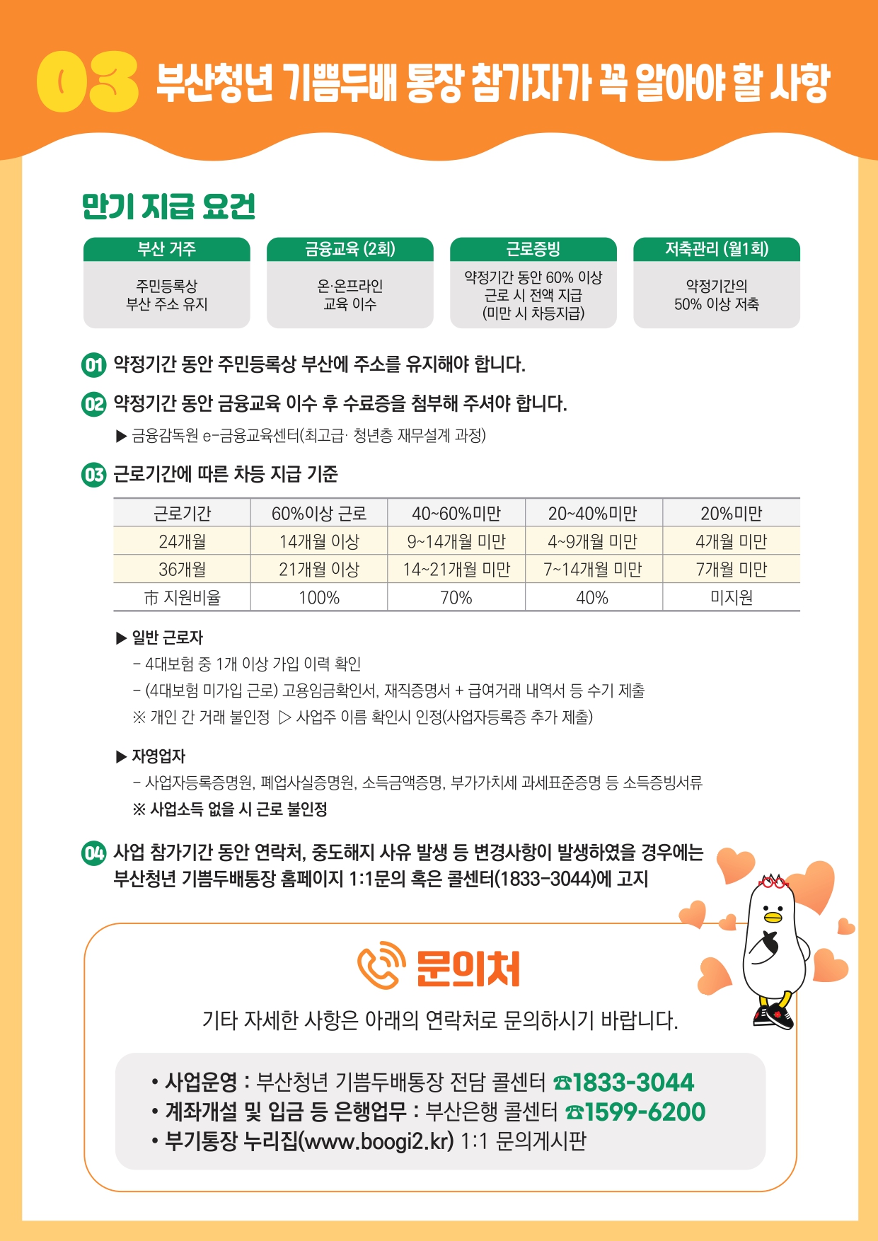 타지역 이주, 근로 중단, 금융교육 미이수 시 부산시 지원금은 환수되며, 이자만 수령 가능합니다.
