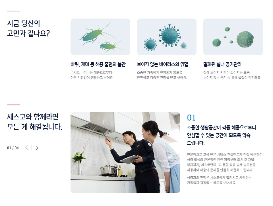 - 정기관리(월 29,000원~36,000원) 등록 시, 세스코 전문가가 매월 방문하여 사전 예방 조치와 소독 작업을 진행합니다.
